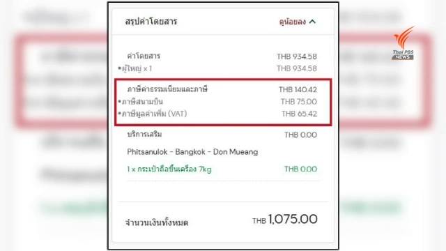 ทีมข่าวไทยพีบีเอส ทดลองค้นหาเที่ยวบินเดินทางจากสนามบินพิษณุโลก ไปยังสนามบินดอนเมือง ในวันนี้ (1 ต.ค.) พบว่าในรายละเอียดค่าโดยสารหมวดค่าธรรมเนียมและภาษี ปรากฏการเรียกเก็บภาษีสนามบินอยู่ที่ 75 บาทต่อคนแล้ว