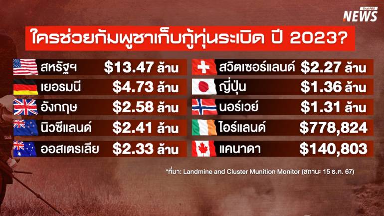 สถานเอกอัครราชทูตสหรัฐอเมริกา ประจำกรุงพนมเปญ ประเทศกัมพูชา ระบุผ่านสื่อสังคมออนไลน์ว่า สหรัฐฯ เตรียมสนับสนุนเงิน 675,000 ดอลลาร์ หรือประมาณ 22 ล้านบาท เพื่อช่วยเหลือกัมพูชาในโครงการเก็บกู้ทุ่นระเบิด ตั้งแต่เดือน พ.ย.2025 ไปจนถึงเดือน เม.ย.2026 หลังจากรัฐบาลอเมริกันยกเว้นข้อจำกัดเรื่องการระงับจัดส่งเงินช่วยเหลือต่างชาติให้กับกัมพูชาเป็นพิเศษ