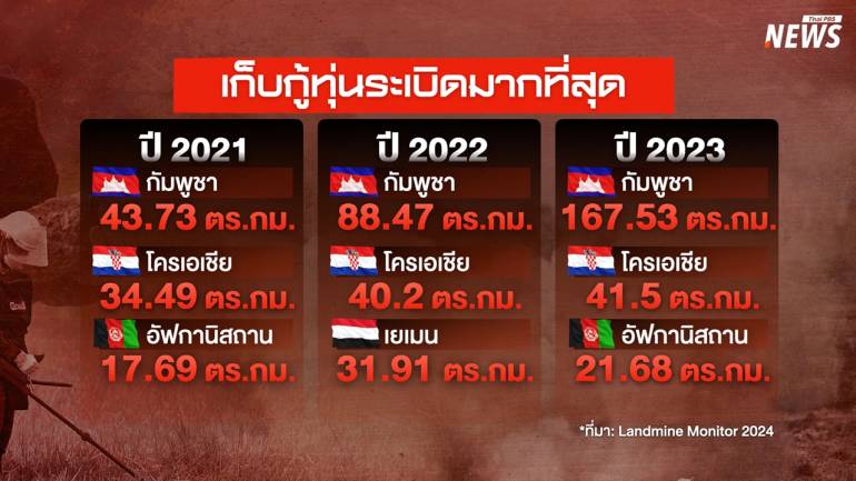 จุดที่น่าสนใจคือ ตัวเลขพื้นที่เก็บกู้ทุ่นระเบิดของกัมพูชาเพิ่มขึ้นอย่างก้าวกระโดด จากมากกว่า 43 ตารางกิโลเมตรในปี 2021 เป็นกว่า 167 ตารางกิโลเมตรเมื่อปี 2023 ขณะที่หากย้อนไปถึงปี 2019 และ 2020 จะพบว่ากัมพูชาเก็บกู้ทุ่นระเบิดติด 5 อันดับแรกของโลกทั้งสิ้น