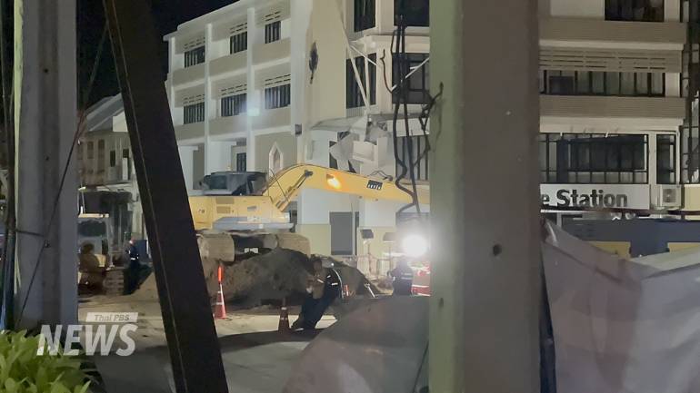 วันนี้ (2 ต.ค.2568) กลางดึกที่ผ่านมา จุดที่เกิดเหตุถนนสามเสนทรุดตัว บริเวณด้านหน้าอาคาร สน.สามเสน เจ้าหน้าที่ระดมใช้รถแบ็คโฮตักทรายถมเติมเข้าไปบริเวณด้านใต้ของอาคาร สน.สามเสน และอาคารพาณิชย์ที่ตั้งอยู่ติดกัน ซึ่งหลังตลอดทั้งวันวานนี้ (1 ต.ค.) ได้ถมทรายลงไปในหลุมจนถึงระดับที่ต้องการ ส่งผลให้ขณะนี้ระดับทรายที่ถมสูงจากคอนกรีตที่เทลงไปก่อนหน้านี้กว่า 2 เมตร