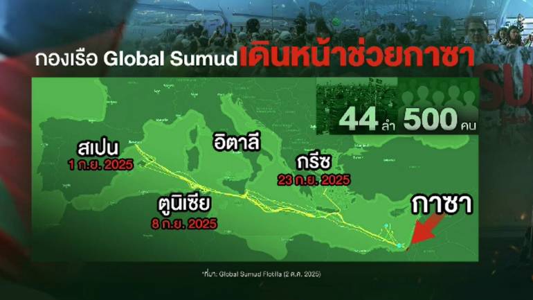 กองเรือ Global Sumud เริ่มภารกิจช่วยเหลือชาวกาซาที่กำลังเผชิญวิกฤตจากสงครามตั้งแต่ 7 ต.ค.2566 ด้วยเรือกว่า 50 ลำจากอย่างน้อย 44 ประเทศ ออกเดินทางจากท่าเรือสเปนตั้งแต่ต้นเดือน ก.ย. และแล่นผ่านหลายประเทศระหว่างทาง แต่ตลอดเส้นทาง พวกเขาเจออุปสรรคหนักหน่วง เช่น การโจมตีจากโดรนต้องสงสัยใกล้เกาะมอลตาและครีตของกรีซ จนเรือบางลำเสียหายและต้องถอนตัว