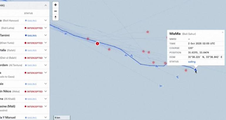 แผนที่จากเว็บไซต์กองเรือแสดงเส้นทางชัดเจน โดยเรือลำแรกถูกสกัดในน่านน้ำสากล ห่างชายฝั่งกาซา 130 กิโลเมตร ข้อมูลล่าสุดจากเว็บไซต์กองเรือบอกว่า จาก 42 ลำที่เหลือ เกือบทั้งหมดถูกอิสราเอลสกัดหรือคาดว่าถูกสกัดแล้ว เหลือเพียง 1 ลำที่ยังลอยลำอยู่