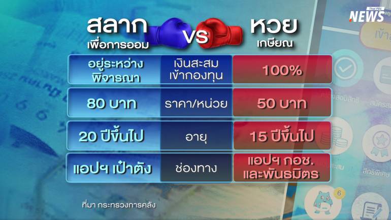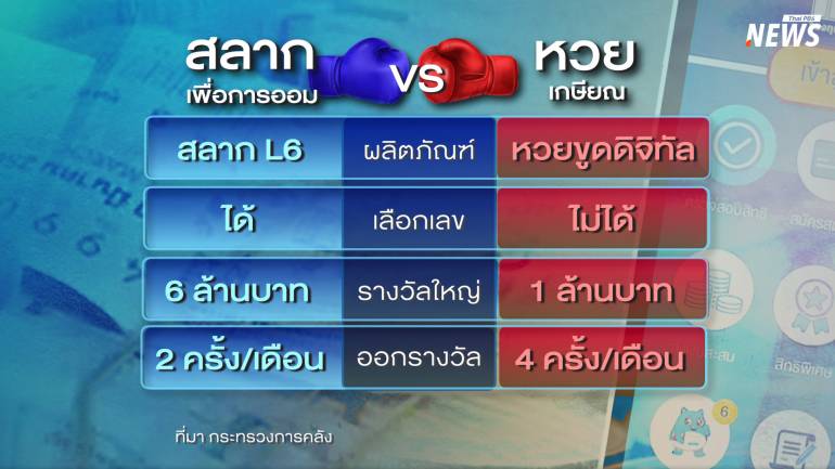 และถ้าเปรียบเทียบ ระหว่าง "สลากเพื่อการออม" กับ "หวยเกษียณ" เป้าหมายทั้งสองนโยบายก็เพื่อการออมเหมือนกัน แต่ ในรายละเอียด มีหลายจุดที่ต่างกัน สลากเพื่อการออม ซื้อผ่าน สลากฯ L6 บนแอปฯ "เป๋าตัง" ใบละ 80 บาท ผู้ซื้อสามารถเลือกเลขสลากฯ ออกรางวัลเดือนละ 2 ครั้ง
