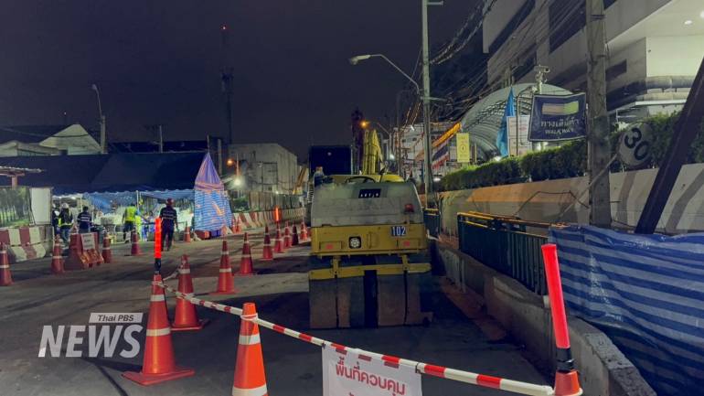 วันนี้ (4 ต.ค.2568) รถแบคโฮ และรถเครน รถแบคโฮ-รถเครน ที่กำลังซ่อมถนนทรุด บริเวณ ถ.สามเสน หน้า รพ.วชิรพยาบาล เขตดุสิต กรุงเทพฯ หยุดพักทำงานในช่วงคืนที่ผ่านมา หลังถมทรายลงไปในหลุมเพิ่มระดับความสูง และถมแอ่งน้ำที่อยู่ภายในหลุม