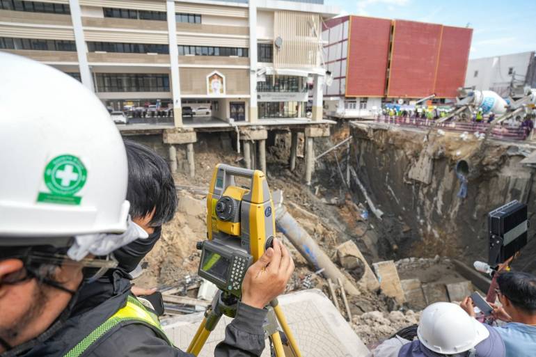 นอกจากนี้ยังได้ทำตัวค้ำยันชั่วคราว หรือ เสาเข็มสั้น จำนวน 3 ต้น และตัดเสาเข็มเดิมออก พร้อมติดตั้งกล้องตรวจสอบความเคลื่อนไหวของอาคาร เพื่อเฝ้าระวังการสั่นสะเทือน ซึ่งขณะนี้ยังไม่พบการเคลื่อนไหวที่รุนแรงและยังคงปกติ ส่วนการทำงานหลังจากนี้จะสั่งการให้รถบรรทุกขนทรายเข้ามาเพื่อเดินหน้าถมทรายต่อ
