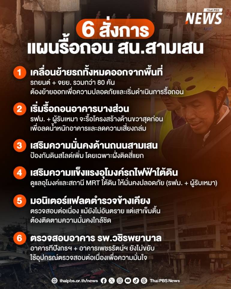 4. การเสริมความแข็งแรงให้อุโมงค์รถไฟฟ้าใต้ดินและสถานีด้านล่าง โดยให้ รฟม. และผู้รับเหมาดูแลอย่างใกล้ชิด เพื่อให้โครงการ MRT ดำเนินต่อได้โดยไม่เสี่ยง