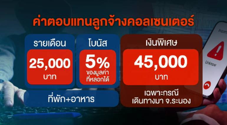 นายธนพงษ์ให้ข้อมูลเพิ่มว่าการจ้างงานแบบนี้เพราะนายจ้างจูงใจด้วยเงินเดือน 25,000 บาท/เดือน บวกที่พักแอร์เย็น อาหาร 3 มื้อ และ โบนัสร้อยละ 5 จากเงินที่หลอกได้ ครั้งก่อนได้ส่วนแบ่ง 150,000 บาทจาก 3,000,000 ครั้งนี้ข้ามมาไทย นายจ้างให้ค่าพาหนะ 45,000 บาท ซึ่งตำรวจยึดได้ด้วย