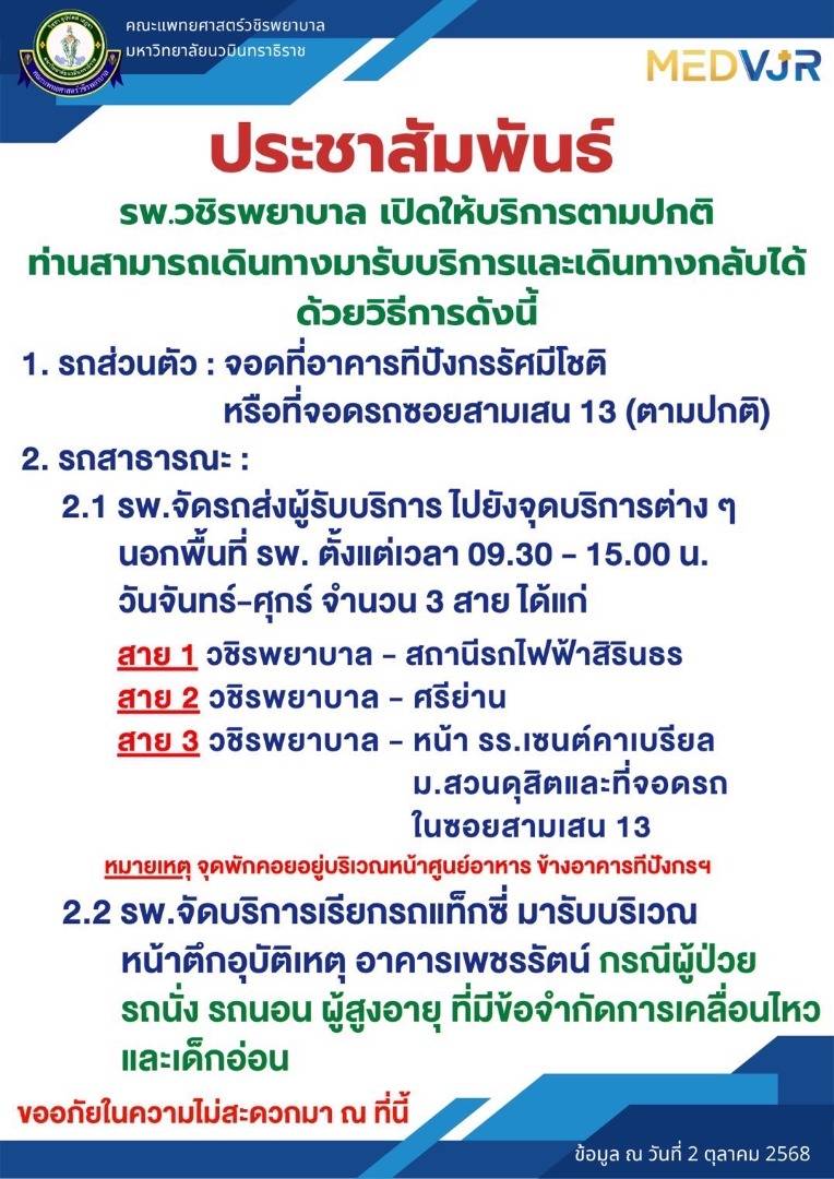 ขณะที่โรงพยาบาลวชิระพยาบาล วันนี้มีผู้ป่วยนัดหมายราว 3,600 คน ทางโรงพยาบาลให้บริการตามปกติ และจัดเตรียมรถรับส่งให้กับผู้มาใช้บริการจำนวน 3 จุด ตั้งแต่ 09.30 น. ถึงเวลา 15.00 น. จากโรงพยาบาล ไปสถานีรถไฟฟ้าสิรินธร, ศรีย่าน และหน้าโรงเรียนเซนต์คาเบรียล หากใครจะนำรถส่วนตัวมา สามารถจอดได้ที่อาคารทีปังกรรัศมีโชติ หรือในซอย 13 ได้ตามปกติ