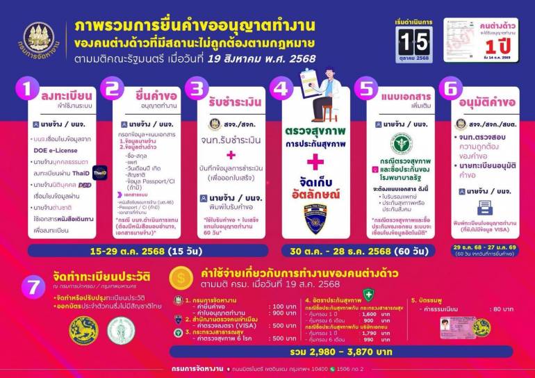 3.หลังจากดำเนินการครบทุกขั้นตอน กรมการจัดหางานจะออกใบอนุญาตให้ทำงานเป็นระยะเวลา 1 ปี จนถึงวันที่ 14 ต.ค.2569