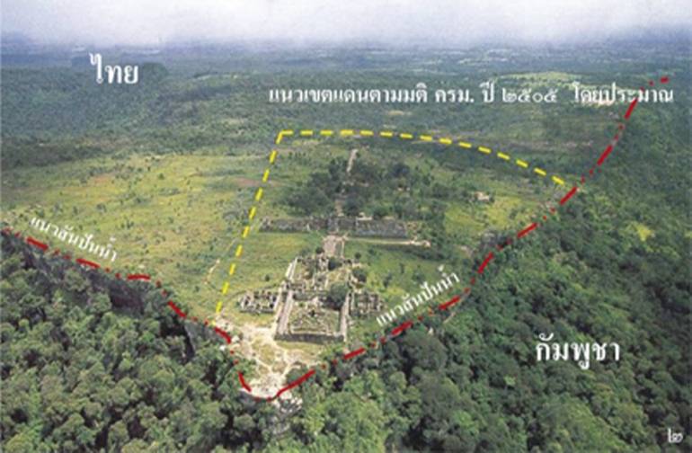 ขณะเดียวกันปมความขัดแย้งระหว่างไทย-กัมพูชา มีที่มาจากปัญหาเส้นเขตแดน ฝ่ายไทยยึดแผนที่มาตราส่วน 1:50,000 มาโดยตลอด ขณะที่ฝ่ายกัมพูชายึดแผนที่มาตรส่วน 1:200,000 กัมพูชาใช้แผนที่แผนที่มาตราส่วน 1:200,000 ระวางดงรัก อ้างสิทธิ์เหนือปราสาทพระวิหาร และยื่นเรื่องต่อศาลยุติธรรมระหว่างประเทศ (ICJ) หรือ ศาลโลก กระทั่งไทยสูญเสียดินแดนในส่วนปราสาทเขาพระวิหาร ในปี ค.ศ.1962