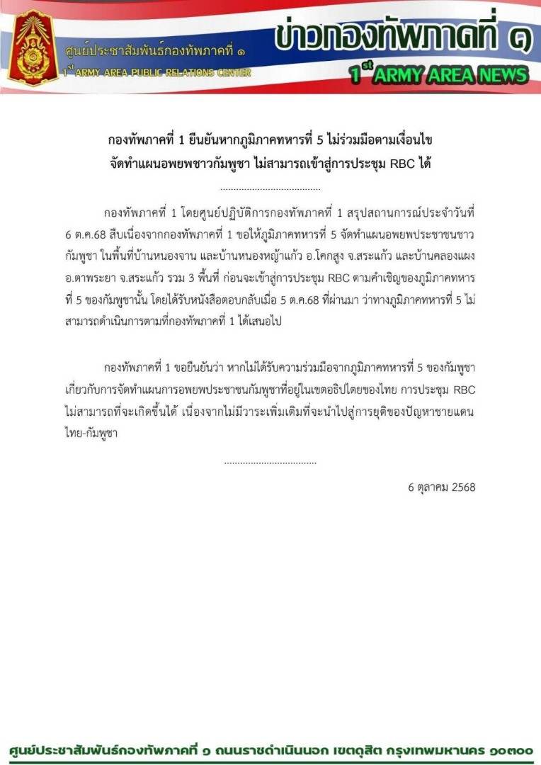 หลังจากได้รับหนังสือจากกัมพูชา บ่ายวันนี้ (6 ต.ค.2568 )กองทัพภาคที่ 1 ระบุว่าได้หนังสือตอบกลับเมื่อ 5 ต.ค.68 ที่ผ่านมาว่าทางภูมิภาคทหารที่ 5 ไม่สามารถดำเนินการตามที่กองทัพภาคทหารที่ 1 ได้เสนอไป ขอยืนยันว่า หากไม่ได้รับความร่วมมือจากกองทัพภูมิภาคทหารที่ 5 ของกัมพูชาเกี่ยวกับการจัดทำแผนการอพยพประชาชนกัมพูชาที่อยู่ในเขตอธิปไตยของไทย