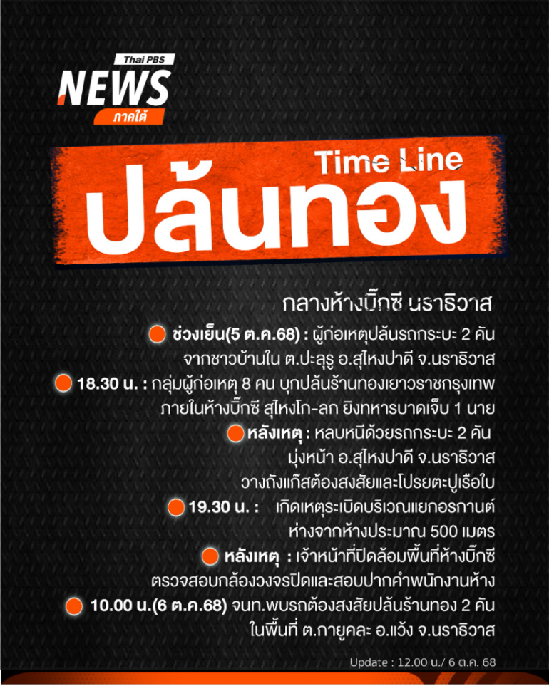 จากเหตุการณ์เมื่อวันที่ 5 ต.ค.2568 เวลาประมาณ 18.29 น. ผู้ก่อเหตุไม่ทราบจำนวน ใช้อาวุธปืนไม่ทราบชนิดและขนาด ปล้นร้านทองภายในห้างสรรพสินค้า อ.สุไหงโก-ลก จ.นราธิวาส ส่งผลให้มีผู้ได้รับบาดเจ็บ 1 คน คือ ส.อ.บุริศวร์ ระดาชัย สังกัดหน่วยเฉพาะกิจสันติสุข ถูกยิงได้รับบาดเจ็บ ขณะพยายามนำอาวุธประจำกายจากรถยนต์ของตนเองเข้าขัดขวาง เบื้องต้นได้นำส่งผู้บาดเจ็บไปรักษาที่โรงพยาบาลสุไหงโก-ลก ซึ่งอาการล่าสุดพ้นขีดอันตรายแล้ว