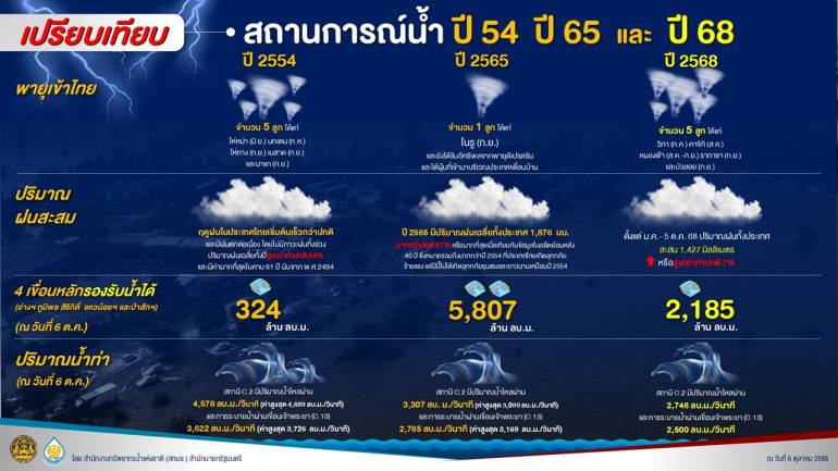 ขณะที่ในปี 2568 แม้จะมีพายุหลายลูก แต่ทั้งหมดส่งผลทางอ้อมและมีทิศทางที่กระทบต่อไทยน้อยกว่า อีกทั้งยังอยู่ภายใต้สภาวะเป็นกลางถึงสภาวะลานีญากำลังอ่อน ทำให้มีฝนโดยรวมไม่มากนัก ซึ่งปัจจุบันปริมาณฝนเฉลี่ยสูงกว่าค่าปกติร้อยละ 7 รวมถึง 4 เขื่อนหลักยังรองรับน้ำได้อีก 2,185 ล้าน ลบ.ม. และมีน้ำไหลผ่านสถานี C.2 ที่ 2,748 ลบ.ม. ต่อวินาที ระบายน้ำเขื่อนเจ้าพระยา 2,500 ลบ.ม.ต่อวินาที