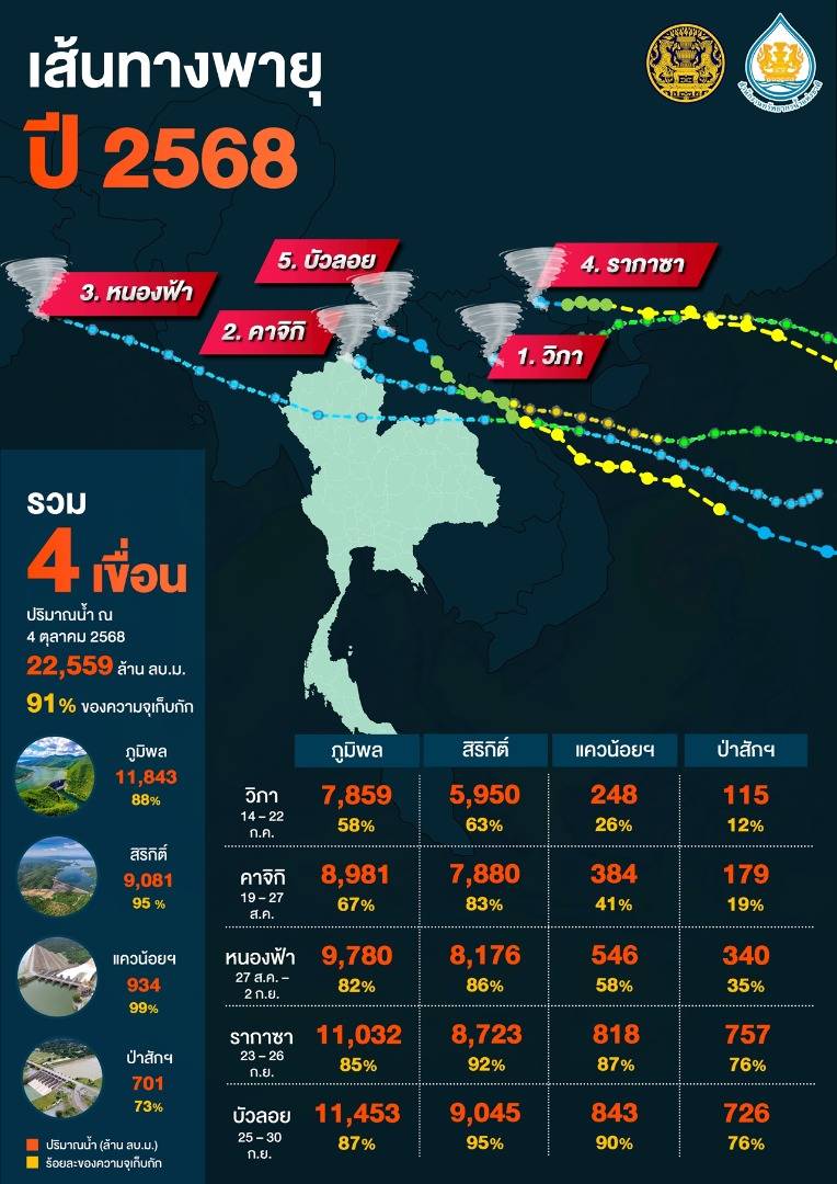 ทำให้ช่วงวันที่ 6-8 ต.ค.นี้ ประเทศไทยจะมีฝนตกปานกลางถึงหนักในภาคเหนือ ภาคตะวันออกเฉียงเหนือและภาคตะวันออก ประกอบกับในช่วง 2-3 วันที่ผ่านมามีฝนตกมากกว่าที่คาดการณ์ไว้ จึงต้องปรับแผนการระบายน้ำของเขื่อนที่มีน้ำมาก เพื่อรักษาความมั่นคงของเขื่อน โดยทยอยปรับเพิ่มการระบายน้ำเขื่อนสิริกิติ์ เป็น 35 ล้านลูกบาศก์เมตร (ลบ.ม.) ต่อวัน ในขณะที่เขื่อนภูมิพล ยังคงระบายน้ำในอัตรา 5 ล้าน ลบ.ม.ต่อวัน