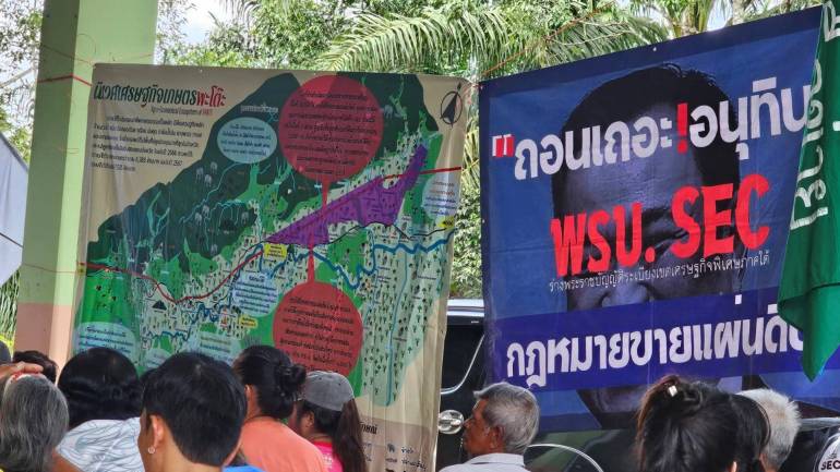 เรื่อง พ.ร.บ.SEC 4 ร่างของพรรคภูมิใจไทย พรรครวมไทยสร้างชาติ และรัฐบาลแพทองธาร ซึ่งได้มอบหมายให้สำนักนโยบายและแผนการขนส่งจราจร (สนข.) จัดทำ เนื้อหาไม่ต่างกัน ประชาชนในพื้นที่ไม่เห็นด้วย อยากให้เสนอแผนพัฒนาภาคใต้ที่ยั่งยืน สนับสนุนการเกษตร ซึ่งมีรายได้รายวันจากยางพารา รายได้ราย 2 สัปดาห์จากปาล์มน้ำมัน และรายได้รายปีจากมังคุดทุเรียนผลไม้ อากาศที่นี่ดีอยู่แล้ว ไม่ต้องเอาสิ่งแปลกปลอมมาให้คนพะโต๊ะ