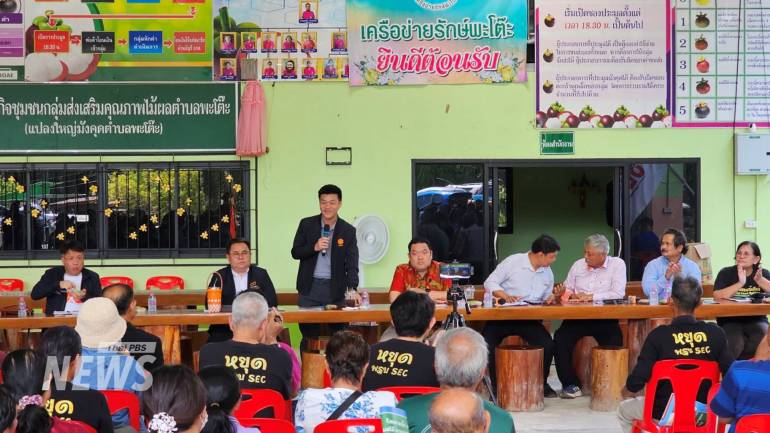เมื่อวันที่ 5 ต.ค.2568 วิสาหกิจชุมชนกลุ่มส่งเสริมคุณภาพไม้ผล ต.พะโต๊ะ อ.พะโต๊ะ จ.ชุมพร นายณัฐพงษ์ เรืองปัญญาวุฒิ ผู้นำฝ่ายค้านในสภาผู้แทนฯ นำทีม สส.พรรคประชาชน รับฟังข้อมูล แลกเปลี่ยนความคิดเห็นโครงการแลนด์บริดจ์ชุมพร-ระนอง โดยมีประชาชนเข้าร่วมประมาณ 200 คน