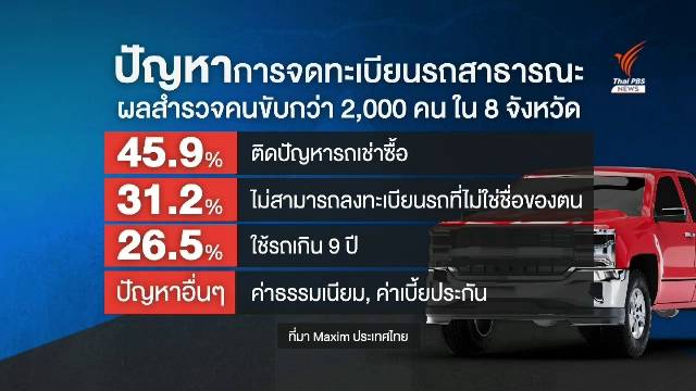 ผลสำรวจคนขับกว่า 2,000 รายใน 8 จังหวัด พบว่า 45.9% ติดปัญหาเรื่องรถเช่าซื้อ, 31.2% ไม่สามารถลงทะเบียนรถที่ไม่ใช่ชื่อของตน, 26.5% ใช้รถเกิน 9 ปี และปัญหาอื่น ๆ เช่น ค่าธรรมเนียมและประกันที่สูง