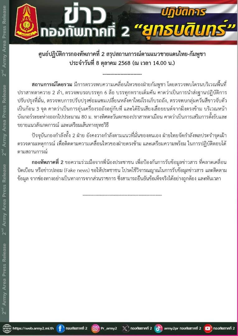 วันนี้ (8 ต.ค.2568) ศูนย์ปฏิบัติการกองทัพภาคที่ 2 เปิดเผยว่า ตรวจพบความเคลื่อนไหวของฝ่ายกัมพูชา โดยตรวจพบโดรนบริเวณพื้นที่ปราสาทตาควาย 2 ลำ และตรวจพบรถบรรทุก 6 ล้อบรรทุกทรายเต็มคัน คาดว่าเป็นการนำส่งฐานปฏิบัติการปรับปรุงที่มั่น