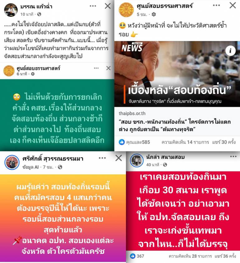 ข้อความจากเพจเฟซบุ๊กต่าง ๆ ที่ติดตามปัญหาการจัดสอบบรรจุรับราชการหรือพนักงานท้องถิ่นปี 2568 หรือ การสอบท้องถิ่นปี 2568 สะท้อนกระแส ดราม่าในสื่อสังคมออนไลน์ ที่ถกเถียงเรื่องการจัดสอบว่า “ส่วนกลางหรือ อปท.ควรเป็นผู้จัดสอบ”