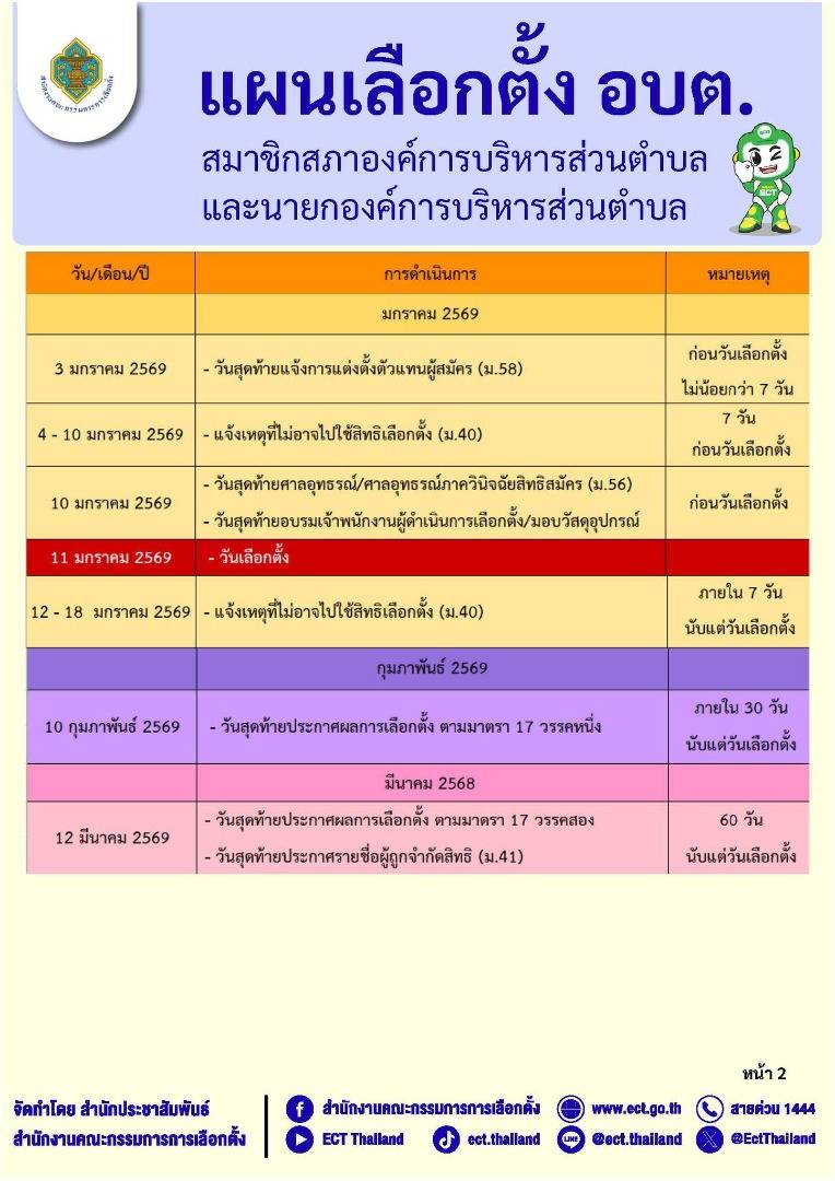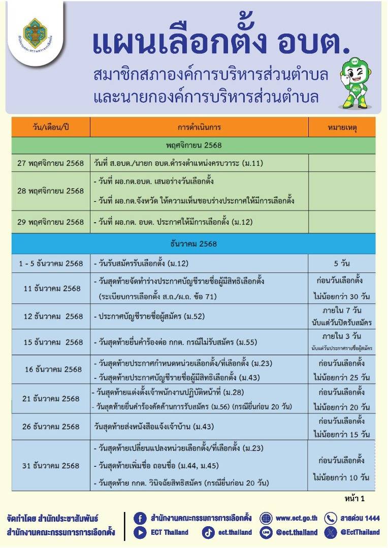 ตามแผนการจัดการเลือกตั้งดังกล่าว กำหนดให้มีการประกาศรับสมัครรับเลือกตั้งระหว่างวันที่ 1 – 5 ธ.ค. 2568 และกำหนดวันเลือกตั้งในวันอาทิตย์ที่ 11 ม.ค.2569 ทั้งนี้ การกำหนดวันรับสมัครและวันเลือกตั้งเป็นอำนาจของผู้อำนวยการการเลือกตั้งประจำองค์การบริหารส่วนตำบล โดยต้องได้รับความเห็นชอบจากผู้อำนวยการการเลือกตั้งประจำจังหวัด