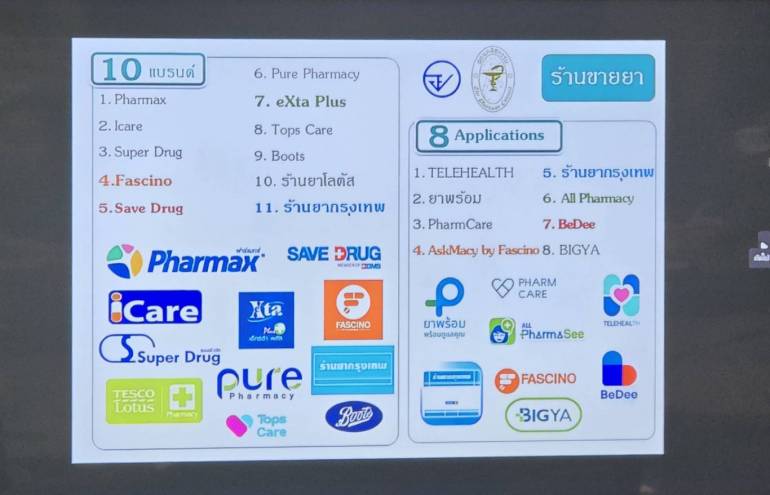 และ 8 แอปพิเคชัน ที่ให้บริการจำหน่ายยาผ่านแพลตฟอร์มออนไลน์ (Applications) เข้าร่วมด้วย ได้แก่ Telehealth, ยาพร้อม, PharmCare, AskMacy by Fascino, ร้านยากรุงเทพ, All Pharmacy และ BIGYA ร่วมกันกว่า1,600 แห่ง ซึ่งมีเภสัชกรประจำให้คำปรึกษาแนะนำอย่างใกล้ชิด โดยทุกฝ่ายเห็นพ้องว่าโครงการนี้จะเป็นการยกระดับระบบสุขภาพของประชาชนให้มีมาตรฐานเดียวกันกับโรงพยาบาลเอกชน และช่วยลดภาระค่าใช้จ่ายด้านยาให้กับประชาชนในวงกว้าง 11 เครือข่ายโรงพยาบาล 354 แห่ง