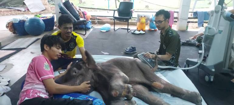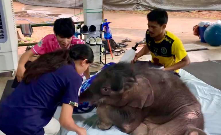 ลูกช้างป่ามีกำลังในการถีบตัวเองให้ยืนขึ้นบ่อยครั้ง โดยมีสัตวแพทย์ และคณะเจ้าหน้าที่ฯ ช่วยพยุงตัว จับเท้ายืดเหยียด และนวดกระตุ้นกล้ามเนื้อขณะเดิน ใช้เครื่องอัลตราซาวน์บำบัด และใช้เครื่อง PMS
