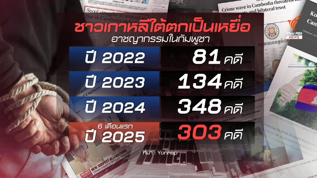 สำนักข่าวบอนฮับ รายงานตามข้อมูลทางการชี้ว่าอาชญากรรมเกิดกับชาวเกาหลีใต้ในกัมพูชาเพิ่มขึ้นอย่างรวดเร็วจาก 81 คดีในปี 2022 เป็น 134 คดีในปี 2023 และ 348 คดีในปี 2024 โดยเฉพาะช่วงครึ่งแรกของปีนี้ 2025 พบแล้วกว่า 303 คดี