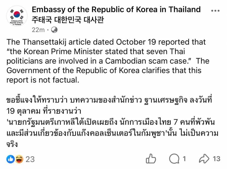 The Thansettakij article dated October 19 reported that "The Korean Prime Minister stated that seven Thai politicians are involved in a Cambodian scam case." The Government of the Republic of Korea clarifies that this report is not factual. The Embassy of the Republic of Korea will take necessary measures against this fake news.