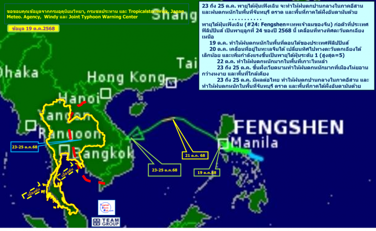 จับตา 23 - 25 ต.ค. พายุไต้ฝุ่นเฟิงเฉินพายุลูกที่ 24 ของปีก่อตัวที่ฟิลิปปินส์ ทำให้ประเทศไทยโดยเฉพาะ อีสานมีฝนตกปานกลาง และฝนตกหนักในพื้นที่จันทบุรี ตราด และพื้นที่ภาคใต้ฝั่งอันดามัน