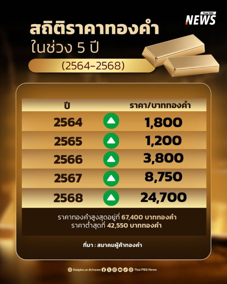 สถิติราคาทองคำจากสมาคมผู้ค้าทองคำ ในช่วง 5 ปี (2564-2568) พบว่า ราคาทองคำปรับขึ้นอย่างต่อเนื่อง โดยปี 2564 ทองคำปรับขึ้น 1,800 บาททองคำ ,ปี 2565 ทองคำปรับขึ้น 1,200 บาททองคำ,ปี 2566 ทองคำปรับขึ้น 3,800 บาททองคำ,ปี 2567 ทองคำปรับขึ้น 8,750 บาททองคำและปี 2568 ทองคำปรับขึ้น 24,700 บาททองคำ โดยราคาทองคำสูงสุดอยู่ที่ 67,400 บาททองคำ ราคาต่ำสุดที่ 42,550 บาททองคำ