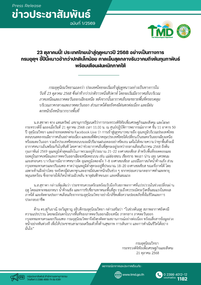 วันนี้ (21 ต.ค.2568) กรมอุตุนิยมวิทยา ออกแถลงการณ์ระบุว่า ประเทศไทยกำลังเข้าสู่ฤดูหนาวอย่างเป็นทางการ ในวันที่ 23 ต.ค.2568 จากการวิเคราะห์ของกรมอุตุฯ พบว่า สภาพอากาศของประเทศไทยตอนบนขณะนี้เข้าเกณฑ์ตามที่กรมอุตุนิยมวิทยา ใช้พิจารณาการเปลี่ยนผ่านเข้าสู่ฤดูหนาว คือ อุณหภูมิต่ำสุดของประเทศไทยตอนบนจะลดลงอย่างต่อเนื่องอยู่ในเกณฑ์อากาศหนาวเย็น โดยมีอุณหภูมิต่ำสุดได้ถึงต่ำกว่า 23.0 องศาเซลเซียส เกือบทั่วพื้นที่