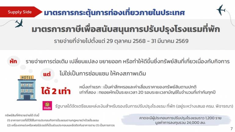 มาตรการภาษีเพื่อสนับสนุนปรับปรุงโรงแรมที่พัก ให้บริษัทหรือผู้ประกอบการโรงแรมสามารถหักรายจ่ายการต่อเติม เปลี่ยนแปลง ขยายออก หรือทำให้ดีขึ้นซึ่งทรัพย์สินที่เกี่ยวเนื่องกับกิจการ (แต่ไม่ใช่เป็นการซ่อมแซมให้คงสภาพเดิม) หักได้ 2 เท่า ตั้งแต่วันที่ 29 ต.ค.2568 - 31 มี.ค.2569