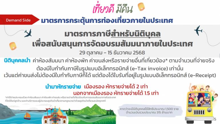 สามารถนำมาหักรายจ่ายได้ 2 เท่าสำหรับการอบรมสัมมนาที่จัดในจังหวัดเมืองรอง นอกจากเมืองรองหักรายจ่ายได้ 1.5 เท่า เริ่มตั้งแต่วันที่ 29 ต.ค. - 15 ธ.ค.2568