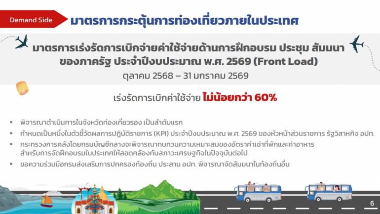 สำหรับหน่วยราชการ รัฐวิสาหกิจและ อปท. ให้เร่งรัดเบิกจ่ายไม่น้อยกว่า 60% นับตั้งแต่เดือน ต.ค.2568 - 31 ม.ค.2569 โดยพิจารณาดำเนินการในจังหวัดท่องเที่ยวเมืองรอง เป็นลำดับแรก และกำหนดเป็นหนึ่งในตัวชี้วัดผลการปฏิบัติราชการ (KPI) ประจำปีงบประมาณ พ.ศ.2569 ของหัวหน้าส่วนราชการ รัฐวิสาหกิจและ อปท.