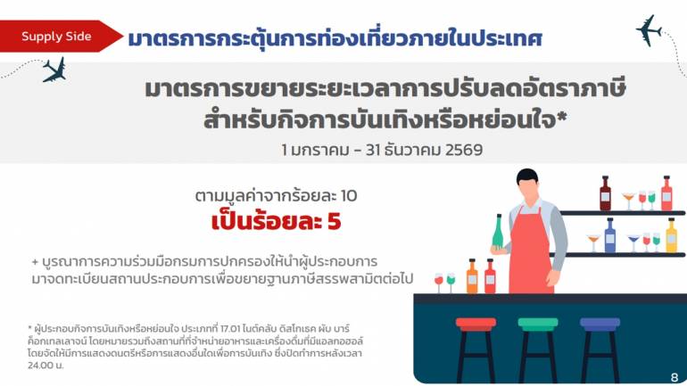 ขยายเวลาปรับลดอัตราภาษีตามมูลค่าจาก 10% เป็น 5% ออกไปอีก 1 ปี มีผลบังคับใช้ตั้งแต่วันที่ 1 ม.ค. - 31 ธ.ค.2569 สำหรับกิจการบันเทิงหรือหย่อนใจ ประเภทที่ 17.01 ไนต์คลับ ดิสโกเธค ผับ บาร์ ค็อกเทลเลาจน์ โดยหมายรวมถึงสถานที่ที่จำหน่ายอาหารและเครื่องดื่มที่มีแอลกอฮอล์ โดยจัดให้มีการแสดงดนตรีหรือการแสดงอื่นใดเพื่อการบันเทิง ซึ่งปิดทำการหลังเวลา