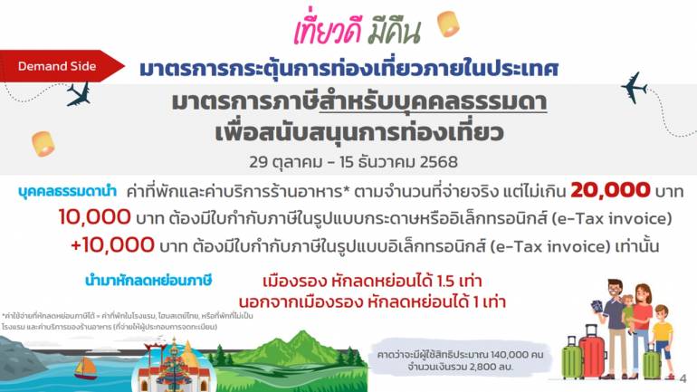 มาตรการนี้ให้สิทธิลดหย่อนสำหรับการท่องเที่ยวเมืองรอง 1.5 เท่า ส่วนเมืองหลัก 1 เท่า เริ่มตั้งแต่วันที่ 29 ต.ค. - 15 ธ.ค.2568