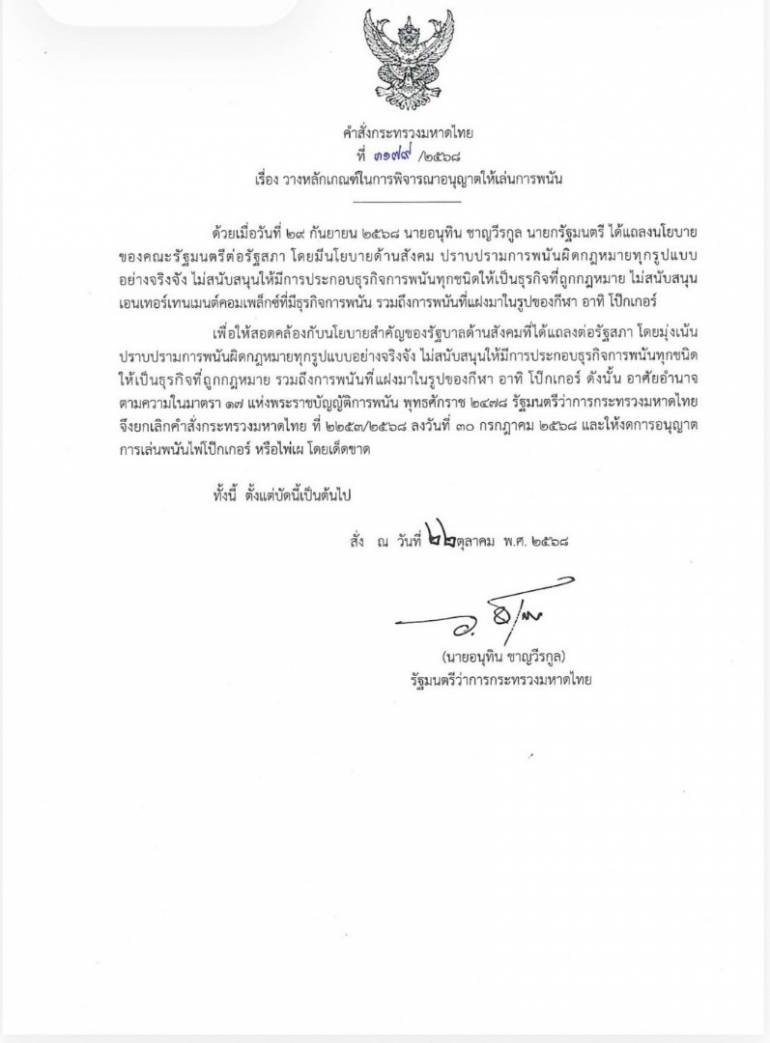 วันนี้ (22 ต.ค.2568) นายอนุทิน ชาญวีรกูล นายกรัฐมนตรี และ รมว.มหาดไทย เซ็นคำสั่งที่ 3179/2568 เรื่อง วางหลักเกณฑ์ในการพิจารณาอนุญาตให้เล่นการพนัน