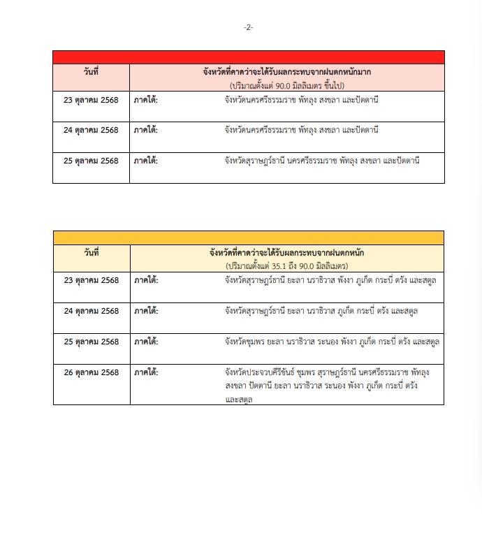 สำหรับภาคใต้มีฝนตกหนักถึงหนักมากบางแห่งในช่วงวันที่ 23-26 ต.ค. 68 เนื่องจากร่องมรสุมกำลังปานกลางพาดผ่านภาคใต้ตอนกลาง ประกอบกับมรสุมตะวันออกเฉียงเหนือพัดปกคลุมอ่าวไทยและภาคใต้ ในจังหวัด ประจวบคีรีขันธ์ ชุมพร สุราษฎร์ธานี นครศรีธรรมราช พัทลุง สงขลา ปัตตานี ยะลา นราธิวาส ระนอง พังงา ภูเก็ต กระบี่ ตรัง และสตูล
