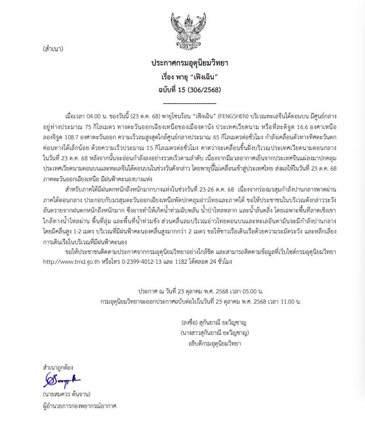 วันนี้ ( 23 ต.ค.2568) เมื่อเวลา 04.00 น. ของวันนี้ (23 ต.ค. 68) กรมอุตุนิยมวิทยา ประกาศเตือน 15 จังหวัดภาคใต้ที่ได้รับผลกระทบจาก พายุโซนร้อน “เฟิงเฉิน” (FENGSHEN) บริเวณทะเลจีนใต้ตอนบน มีศูนย์กลางอยู่ห่างประมาณ 75 กิโลเมตร ทางตะวันออกเฉียงเหนือ ทางตะวันออกเฉียงเหนือของเมืองดานัง ประเทศเวียดนาม หรือที่ละติจูด 16.6 องศาเหนือ ลองจิจูด 108.7 องศาตะวันออก ความเร็วลมสูงสุดใกล้ศูนย์กลางประมาณ 65 กิโลเมตรต่อชั่วโมง กำลังเคลื่อนตัวทางทิศตะวันตกค่อนทางใต้เล็กน้อย ด้วยความเร็วประมาณ 15 กิโลเมตรต่อชั่วโมง คาดว่าจะเคลื่อนขึ้นฝั่งบริเวณประเทศเวียดนามตอนกลาง ในวันที่ 23 ต.ค. 68 หลังจากนั้นจะอ่อนกำลังลงอย่างรวดเร็วตามลำดับ
