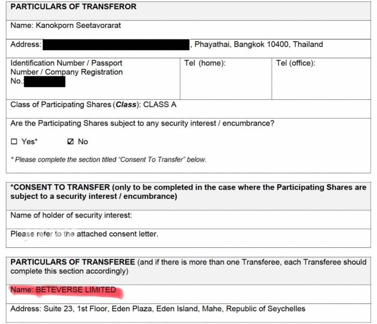 Beteverse Limited เป็นบริษัทจดทะเบียน จัดตั้ง ในประเทศเซเชลส เมื่อวันที่ 2 ก.ค.2567 ซึ่งเป็นเวลา 6 เดือน ก่อนเกิดการทำธุรกรรมนี้