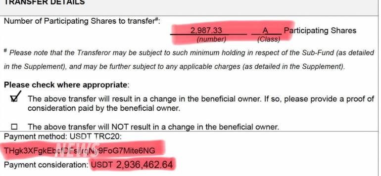 รายละเอียดการโอนแสดงการขายหุนจำนวน 2,987.33 หุ้นในราคา USDT 2,936,462.64 ผ่าน กระเป๋าเงิน THgk3XFgkEbcfDFsurgNyqFoG7Mite6NG