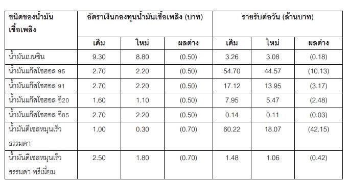 สำหรับการปรับลดเงินส่งเข้ากองทุนน้ำมันฯ ครั้งนี้ จะทำให้รายรับของกองทุนน้ำมันฯ เหลือวันละ 86.67 ล้านบาท จากเดิมมีรายรับวันละ 145.22 ล้านบาท (รวมน้ำมันเตาวันละ 0.36 ล้านบาท) ขณะที่ฐานะกองทุนน้ำมันเชื้อเพลิง ณ วันที่ 19 ตุลาคม 2568 ติดลบอยู่ที่ 14,754 ล้านบาท แต่ยังมีบัญชีน้ำมันเป็นบวก อยู่ที่ 26,910 ล้านบาท และบัญชี LPG ติดลบอยู่ที่ 41,664 ล้านบาท
