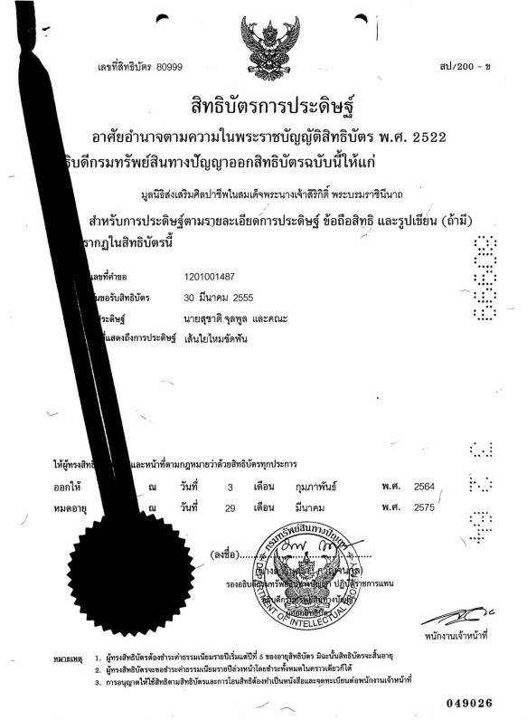 นอกจากนี้ ยังมีผลงานที่ได้รับการจดทะเบียนสิทธิบัตรการประดิษฐ์ 8 ฉบับ เช่น สบู่ไหมชนิดก้อนที่ใช้ผงไหมเซริซินที่มีสารต้านอนุมูลอิสระและช่วยกำจัดจุลินทรีย์บางชนิดที่เป็นสาเหตุของโรคผิวหนัง (สิทธิบัตรฉบับแรกที่ได้รับการจดทะเบียน เมื่อปี 2546) วิธีการผลิตวัสดุตกแต่งผิวปีกแมลงทับ เพื่อนำปีกแมลงทับมาประดิษฐ์เป็นเครื่องประดับชนิดต่างๆ (ปี 2547) องค์ประกอบข้าวปรุงหลายชนิด