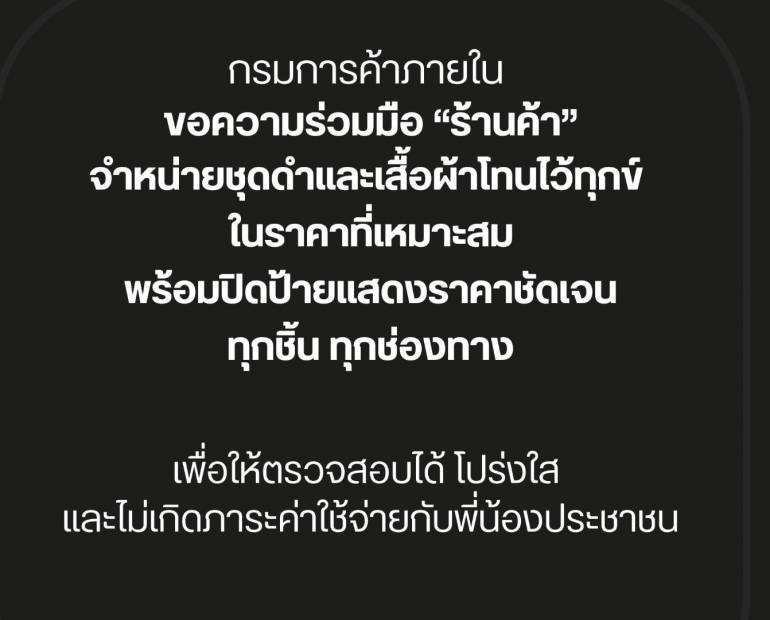 พาณิชย์ ย้ำขอความร่วมมือผู้ประกอบการจำหน่ายชุดดำในราคาที่เหมาะสม ไม่ฉวยโอกาสขึ้นราคา ต้องปิดป้ายชัดเจน – สถานการณ์จำหน่ายทั่วประเทศราคาทรงตัว สินค้ามีเพียงพอรองรับความต้องการประชาชนช่วงถวายความอาลัย