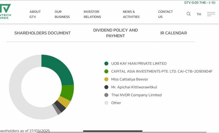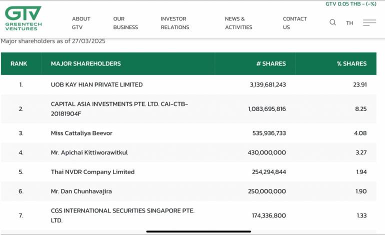 ผู้ถือหุ้นรายสำคัญของบริษัท กรีนเทค เวนเจอร์ส จำกัด (มหาชน) (GTV) ได้แก่ UOB KAY HIAN PRIVATE LIMITED (23.91 %), CAPITAL ASIA INVESTMENTS PTE. LTD. (8.25 %), น.ส. แคทรียา บีเวอร์ (4.08 %) ซึ่งเป็นภรรยา ของ เบนจามิน เมาเออเบอร์เกอร์ และนาย อภิชัย กิตติวรวิทย์กุล (3.27 %) และในรายชื่อผู้ถือหุ้นรายที่ 6 มีชื่อ นายแดน ชุณหวชิร ลูกชายของนายพิชัย ชุณหวชิร อดีตรองนายกรัฐมนตรี และรัฐมนตรีคลัง ในรัฐบาลนายเศรษฐา - แพทองธาร เป็นผู้ถือหุ้นสัดส่วน (1.90 %)