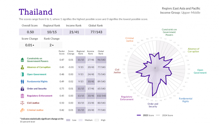 วันนี้ (28 ต.ค.2568) สถาบันเพื่อการยุติธรรมแห่งประเทศไทย เปิดผลรายงาน WJP Rule of Law Index 2025 จัดทำโดย World Justice Project (WJP) พบว่า ในปีนี้ประเทศไทยได้คะแนนรวม 0.50 จากคะแนนเต็ม 1.00 อยู่ในอันดับที่ 77 จาก 143 ประเทศทั่วโลก โดยคะแนนปรับเพิ่มขึ้นเล็กน้อยคิดเป็น +1.0% จากปีที่ผ่านมา