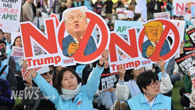 ขณะเดียวกัน ชาวเกาหลีใต้หลายร้อยคนรวมตัวชุมนุมในเมืองคยองจูเพื่อต่อต้านทรัมป์ โดยชูป้าย "No Trump" และ "Trump Out" ผู้ประท้วงวิจารณ์ว่านโยบายของทรัมป์กำลังทำลายเศรษฐกิจเกาหลีใต้ รวมถึงข้อเรียกร้องให้เกาหลีใต้ลงทุนในสหรัฐ 350,000 ล้านดอลลาร์ เพื่อแลกกับการลดภาษีนำเข้าสินค้าเกาหลีใต้ ซึ่งมองว่าเป็นการเอารัดเอาเปรียบมากเกินไป บางส่วนยังโจมตีผู้นำเกาหลีใต้ว่าประจบสอพลอทรัมป์มากเกินไป ระหว่างการประท้วงเมื่อวานนี้ มีรายงานว่าตำรวจควบคุมตัวผู้ประท้วงบางคนออกไป