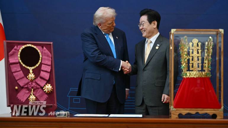 ในช่วงเช้าวันเดียวกัน ทรัมป์เดินทางถึงเกาหลีใต้ ซึ่งเป็นหมุดหมายสุดท้ายของการเยือนเอเชียรอบนี้ และเข้าพบ อี แจ-มยอง ทันทีหลังถึงคยองจู เพื่อเตรียมร่วมประชุม APEC ในวันนี้ ปธน.เกาหลีใต้ได้มอบมงกุฎทองคำจำลองและเครื่องอิสริยาภรณ์มูกุงฮวา (Mugunghwa) ซึ่งเป็นเครื่องราชอิสริยาภรณ์ชั้นสูงสุดให้ทรัมป์ เพื่อยกย่องผลงานในการสร้างสันติภาพบนคาบสมุทรเกาหลี โดยเจ้าหน้าที่ระบุว่าทรัมป์เป็นประธานาธิบดีสหรัฐฯ คนแรกที่ได้รับเกียรตินี้ ทรัมป์กล่าวขณะรับมอบว่า "อยากจะสวมตอนนี้เลย"