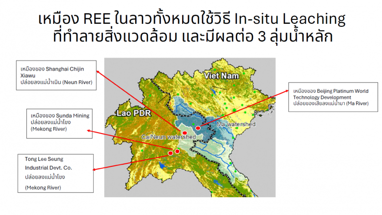ข้อมูลจากมูลนิธิสิทธิมนุษยชนไทยใหญ่ ได้ศึกษาผลกระทบการทำเหมืองแร่ในพื้นที่รัฐฉาน-คะฉิ่น ประเทศเมียนมา ระบุว่าการทำเหมืองแร่หายาก ในประเทศลาววิธีสกัดแร่แบบชะละลาย (in-situ leaching) ที่ฉีดสารเคมีจำนวนมากเข้าไปในเชิงเขา มีในพื้นที่ 3 ลุ่มน้ำหลักของแม่น้ำโขง คือลุ่มแม่น้ำเนิน ลุ่มแม่น้ำเงียบ และลุ่มน้ำมา โดยการสร้างเขื่อนกั้นลำน้ำเพื่อผลิตกระแสไฟฟ้า และกักเก็บตะกอนสารพิษเหล่านี้