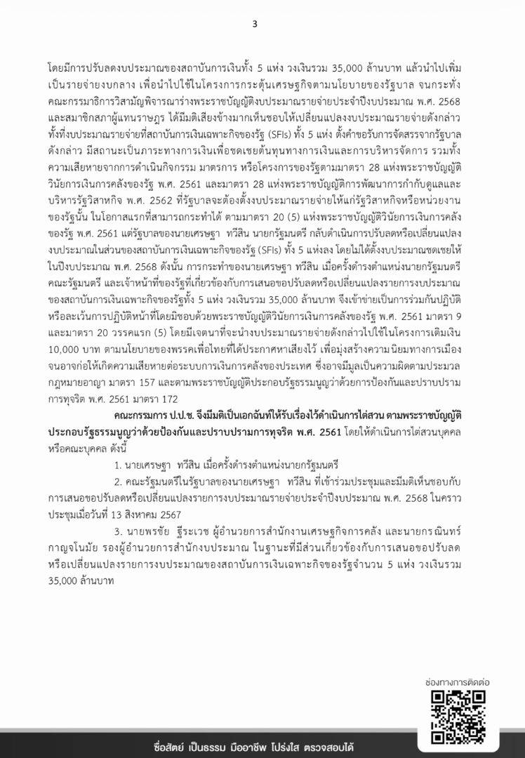 อย่างไรก็ดี เมื่อปรากฏข้อเท็จจริงจากการสอบสวนว่า นายเศรษฐา ทวีสิน นายกรัฐมนตรี และคณะรัฐมนตรี ได้มอบนโยบายหรือมีมติสั่งการให้สำนักงบประมาณ (สงป.) ร่วมกับสำนักงานเศรษฐกิจการคลัง (สศค.) ดำเนินการให้สถาบันการเงินเฉพาะกิจของรัฐ (SFIs) จำนวน 5 แห่ง พิจารณาทบทวนงบประมาณรายจ่ายที่ได้ตั้งคำขอไว้ โดยให้เสนอปรับลดงบประมาณของตนเองลงเพื่อเปลี่ยนแปลงรายการงบประมาณดังกล่าวไปเป็นค่าใช้จ่ายในโครงการกระตุ้นเศรษฐกิจตามนโยบายของรัฐบาล